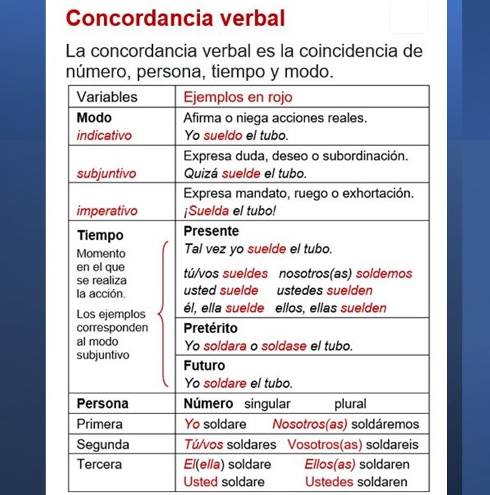 La concordancia verbal es la coincidencia del verbo con el sujeto en número y persona.