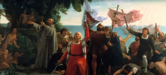 Representación artística del descubrimiento de América por Cristóbal Colón, destacando la llegada de los europeos al Nuevo Mundo (Desembarco de Cristóbal Colón, de Dióscoro de Puebla).