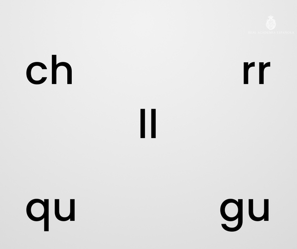 El español cuenta con cinco dígrafos o secuencias de dos letras que representan un único sonido: «ch» («chapa»), «ll» («lluvia»), «qu» («queso»), «gu» («pliegue»), «rr» («arroz»).